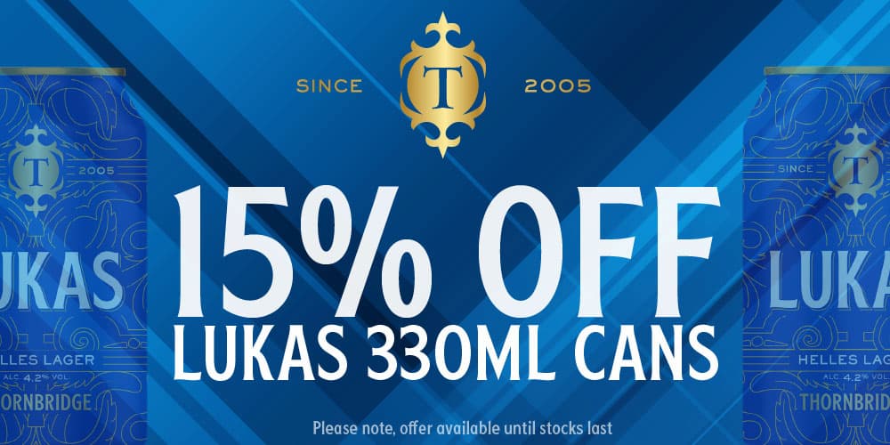 Take me to the LukasStock up with 15% off a case Lukas cans, our fantastic Helles Lager